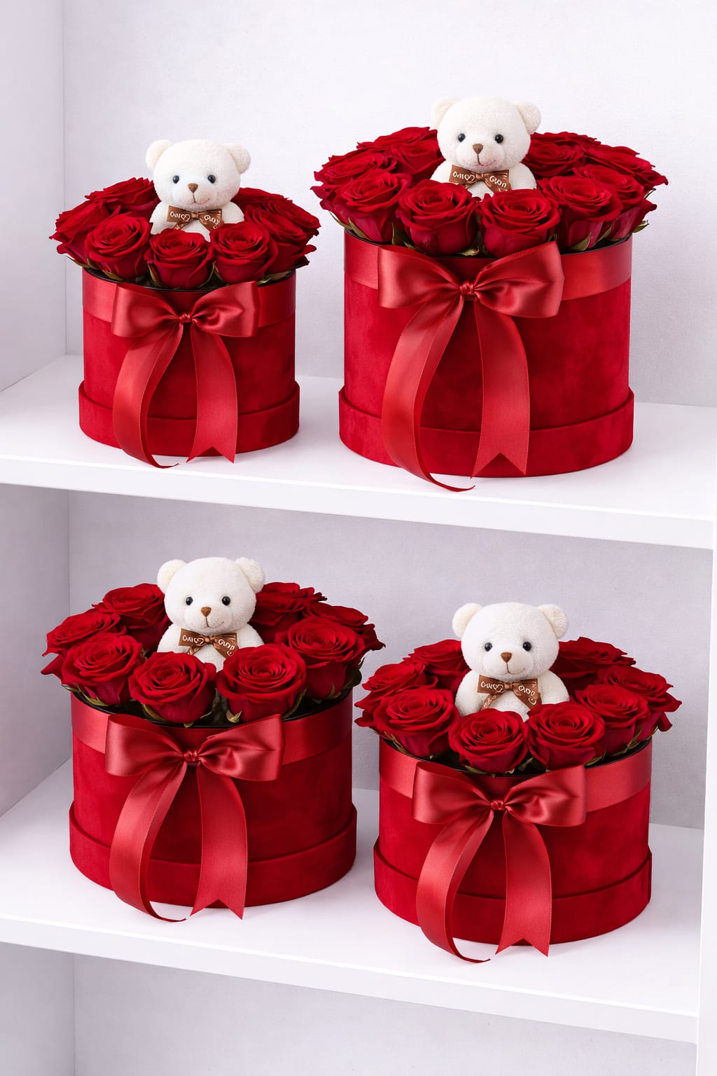 Najslađe rješenje. Medvjedića ćete pronaći skrivenog u crvenim ružama stavljenim u pripadajuću crvenu kutiju s mašnom.  Box dolazi uz personaliziranu ručno napisanu poruku koju ostavljate prilikom kupovine artikla.