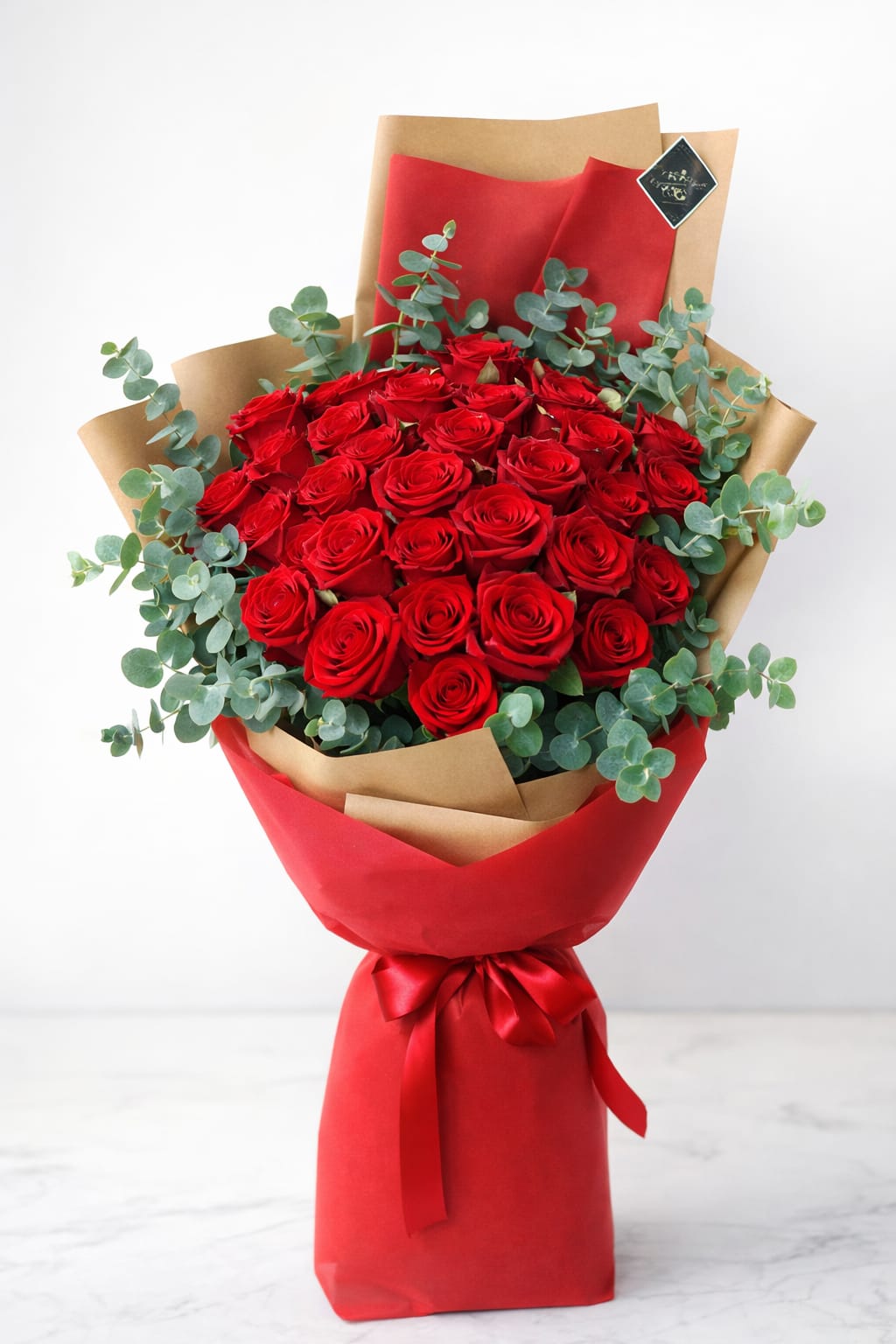 Elegantan buket ruža po izboru s eukaliptusom umotan u ukrasni papir s pripadajućom crvenom mašnom. Buket dolazi uz personaliziranu ručno napisanu poruku koju ostavljate prilikom kupovine artikla.