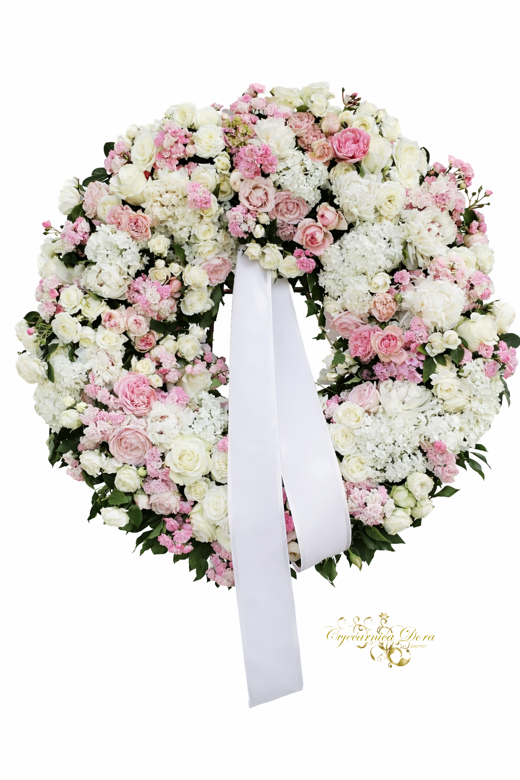 Puni krug ispunjen raznolikim cvijećem u svjetlo rozim i bijelim tonovima. Ovisno o sezoni cvijeće se može razlikovati. Promjer cijelog vijenca je 80 cm, rađen na kolutu veličine 60cm.